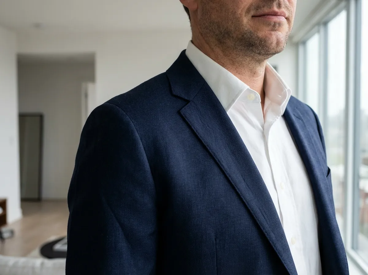 Marynarka szyta na miarę — linia ramion, klapy, kieszenie i guziki dopasowane do stylu.