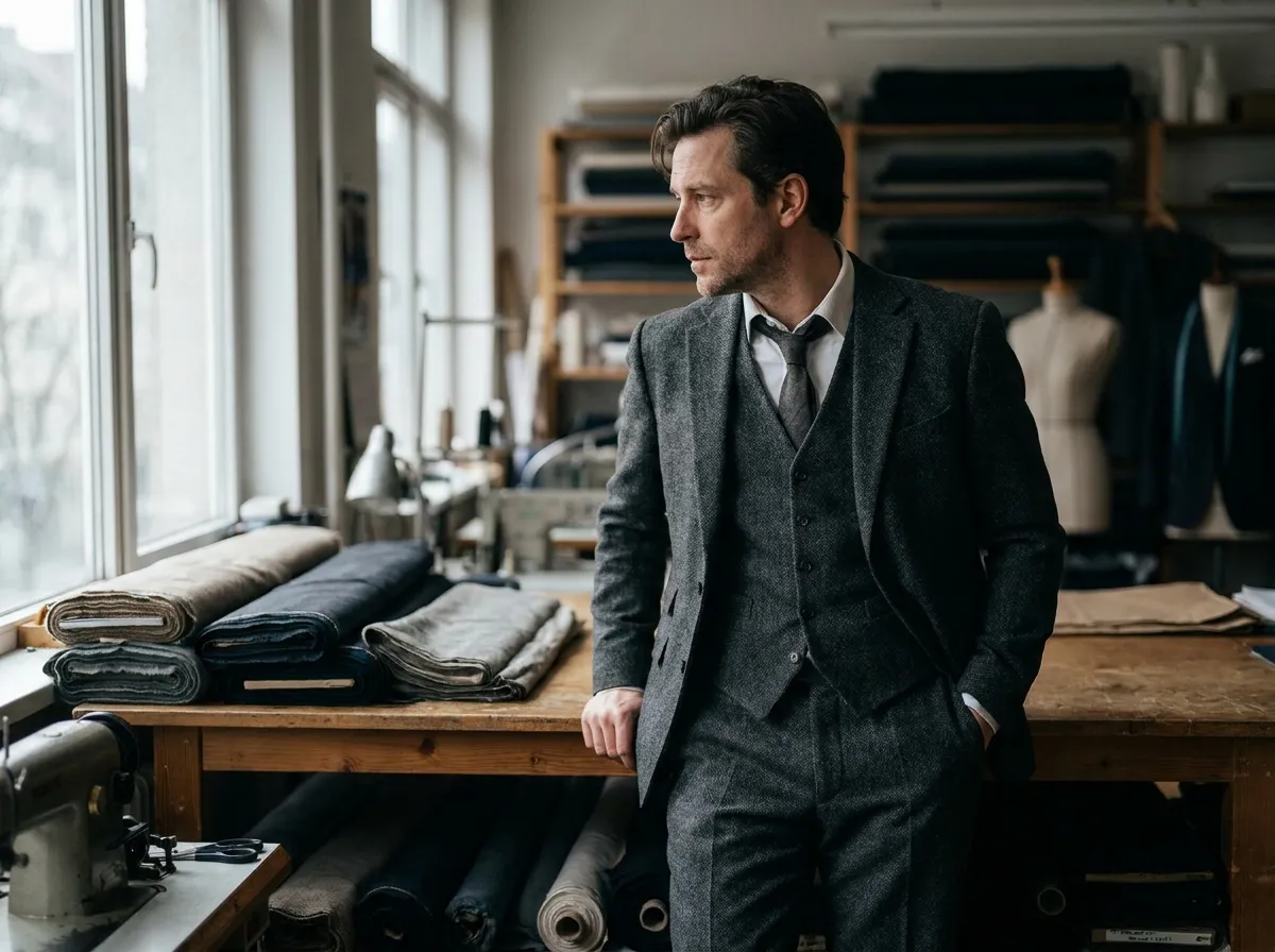 Garnitury, marynarki, spodnie, koszule i kamizelki — dobór kroju, tkaniny i detali.