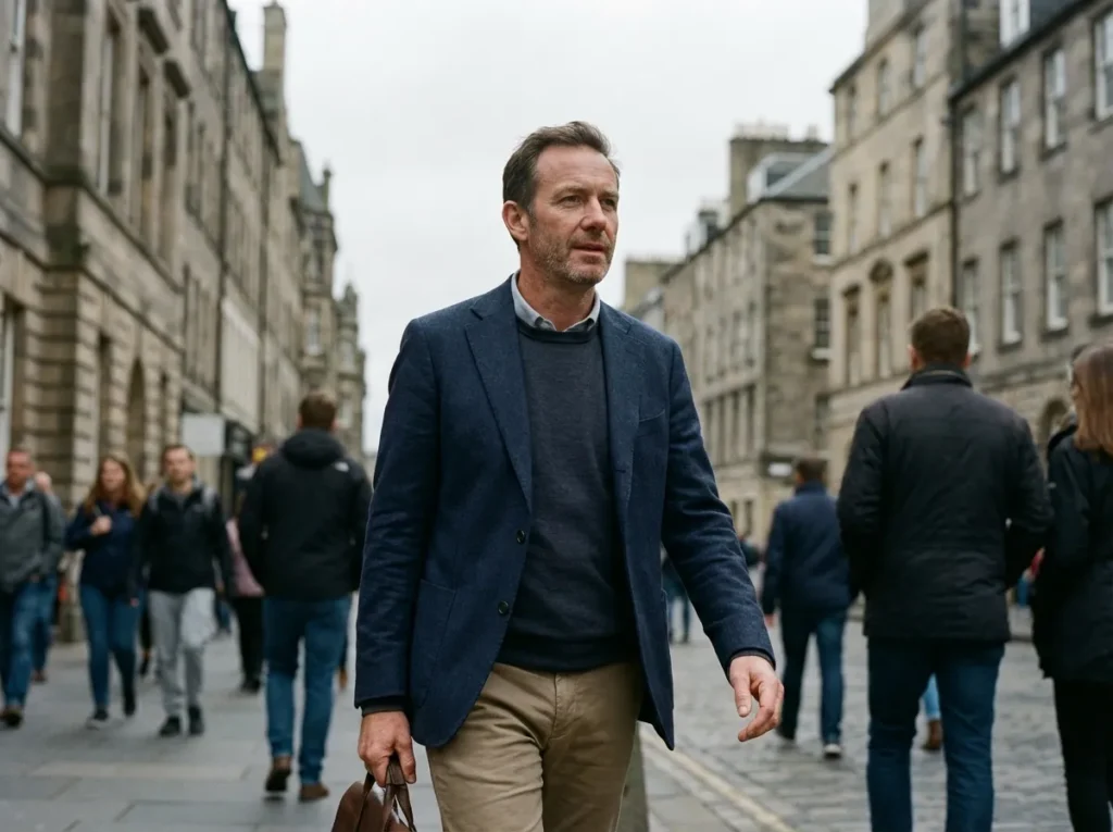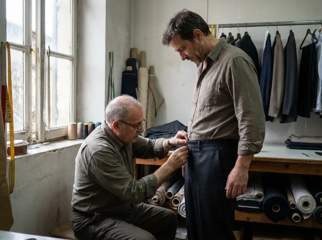 Wielu mężczyzn skupia się niemal wyłącznie na marynarce, a tymczasem spodnie do sylwetki są równie ważne. Zły stan potrafi skrócić nogi, uwydatnić brzuch albo popsuć linię zapięcia marynarki. Zła szerokość nogawki może zrobić efekt toporności lub przeciwnie — zbyt modowej ciasnoty. Zła długość psuje cały obraz przy bucie. Załamania materiału przy kostce i nad butem są jednym z najszybciej zauważalnych błędów.